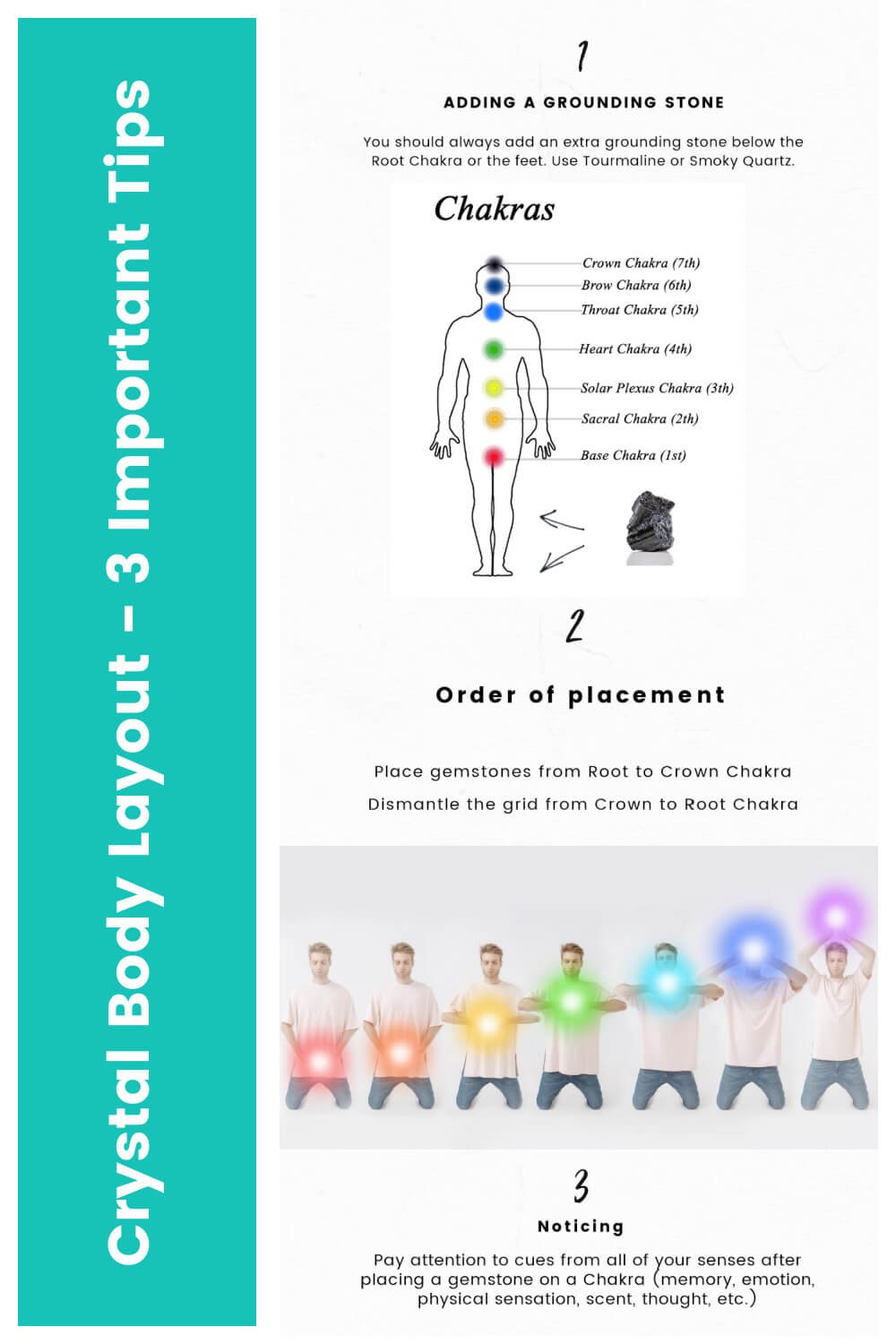 First, you will need a set of 7 gemstones. One gemstone associated for each of the Chakra + a Clear Quartz (point preferably) and a grounding stone (Smoky Quartz, Black Tourmaline or Hematite).
