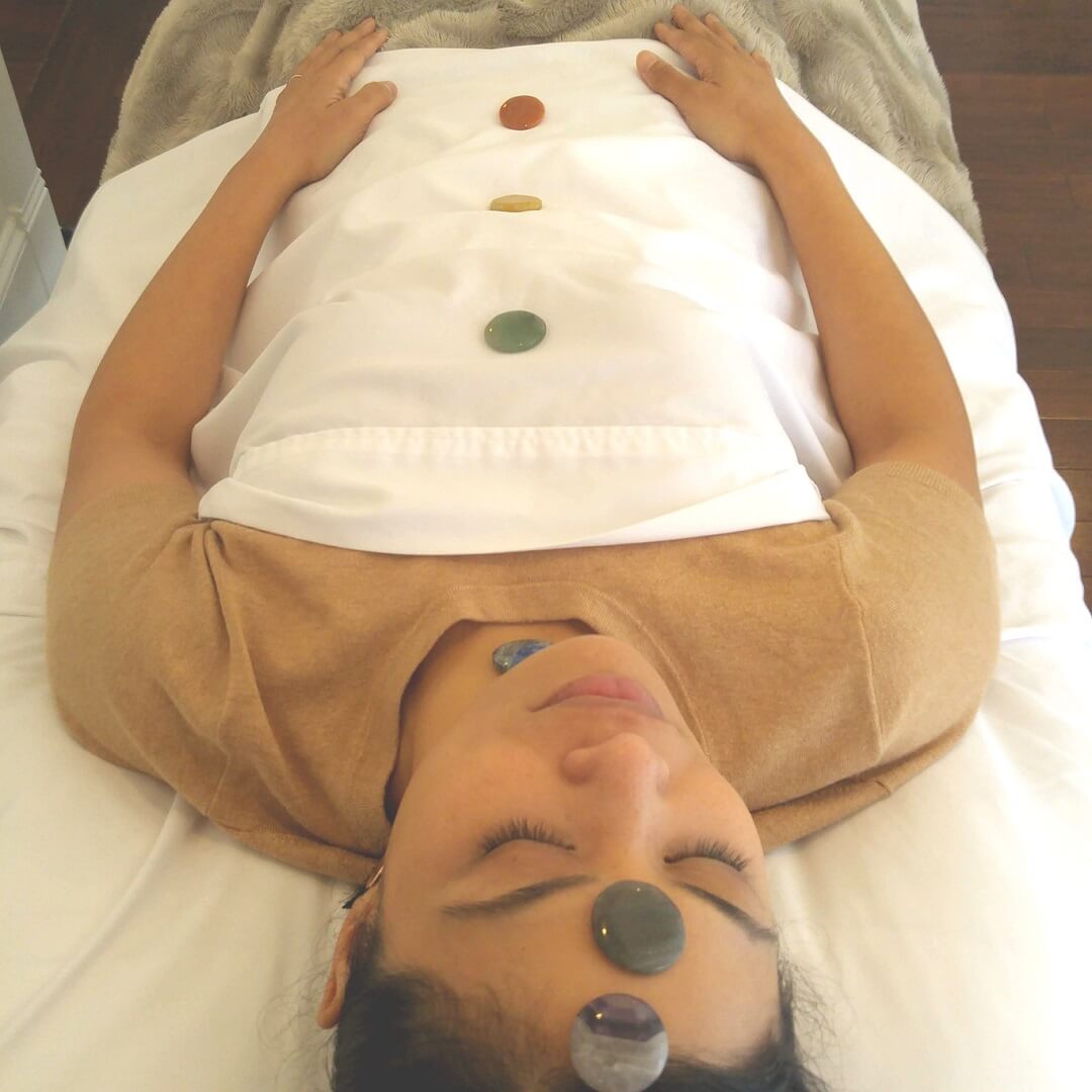 - Starting with the Root Chakra, place the color matching gemstone on the corresponding Chakra along the body. Bring your focus and awareness to this area and visualize the Chakra opening like a flower blossoming.